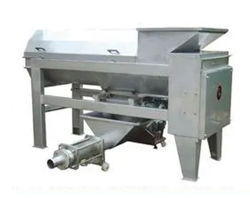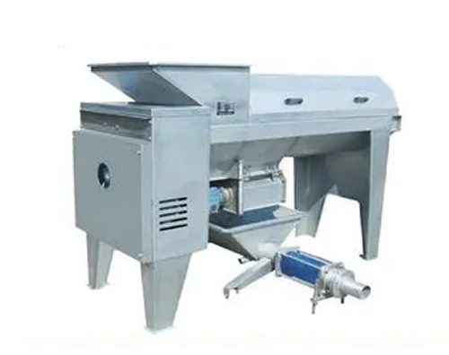 石榴從進料斗進入上破碎裝置,上破碎裝置將石榴壓開,兩輥間隙為20毫米,然后進入下破碎裝置,下破碎裝置再次將石榴擠壓,兩輥間隙為10毫米,經(jīng)過兩級擠壓的石榴已基本皮籽分離,并落入分離裝置,在攪拌軸的攪拌下,石榴籽從篩孔落下,石榴皮從尾部排出,上下破碎輥為彈性結構,間隙可調。石榴籽及汁用螺桿泵送至壓榨機。