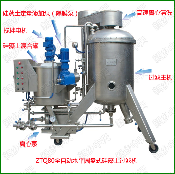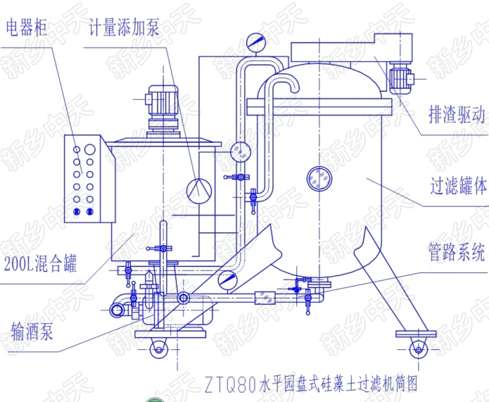 8、本機(jī)所選用的硅藻土添加泵為隔膜式計(jì)量泵,其采用國外技術(shù)生產(chǎn),結(jié)構(gòu)簡單,計(jì)量精確,且可根據(jù)待濾液的渾濁程度,隨時(shí)調(diào)節(jié)硅藻土等助濾劑的添加量。