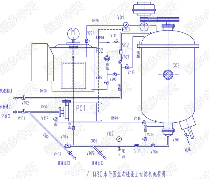 過濾時(shí),首先在過濾盤上形成硅藻土預(yù)涂層。被過濾的液體經(jīng)硅藻土預(yù)涂層時(shí),其中的雜質(zhì)即被阻擋;而純靜的液體經(jīng)過微觀管狀或片狀的間隙以及顆粒之間的間隙通過過濾層,從而起到過濾作用。隨過濾時(shí)間的推移,在預(yù)涂層上被濾掉的雜質(zhì)會越來越多,且將阻塞過濾通道。因此在過濾過程中,還需對進(jìn)入過濾罐的被過濾的液體,添加一定劑量相應(yīng)粒度的硅藻土,以維持正常的過濾過程。另外,如果過濾時(shí)需要脫色,還需加入一定比例的活性炭。