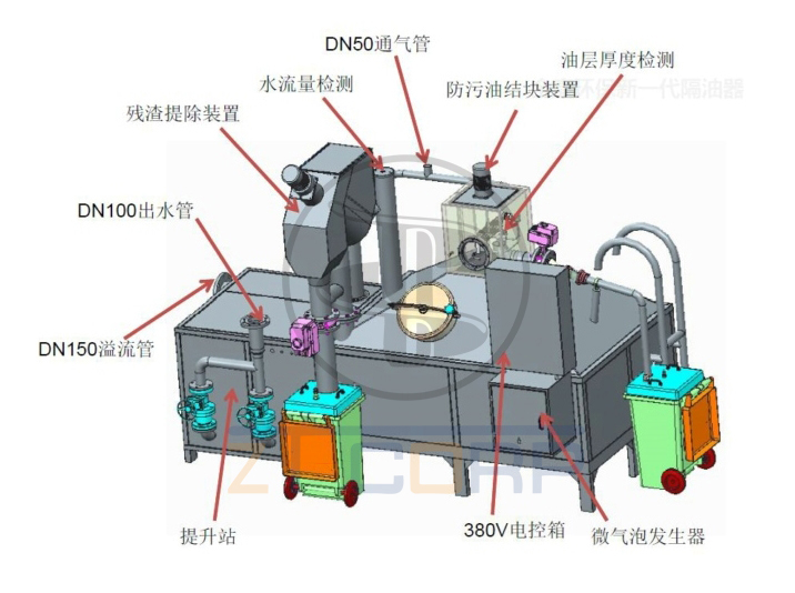 餐飲廢水以及其它含油污水在進入隔油池前首先通過殘渣提除裝置,可以有效過濾掉殘渣并自動提走,通過以上功能有效實現(xiàn)餐飲廢水以及其它油污液體的油、水、渣的三相分離。