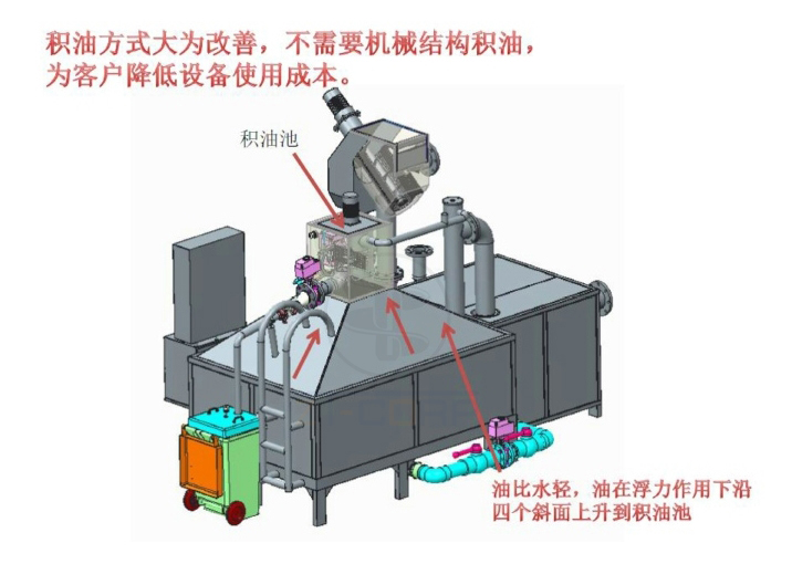 該油水分離裝置主要利用油與水的比重不同,油比水輕,油在浮力作用下沿著隔油池斜面上升到集油池,油集聚到一定的量而自動排出,分離后的水從另一端(提升站)排出,從而實現(xiàn)餐飲廢水以及其它油污廢水的油水分離,進而實現(xiàn)油品綜合利用,外排廢水動植物油的含量達到環(huán)保標(biāo)準(zhǔn)。